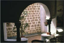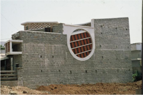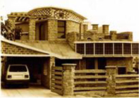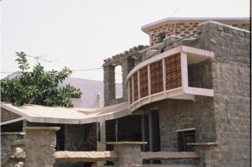 A rugged unconventional form was what the client desired. The house in stone is built around a semi circular court.